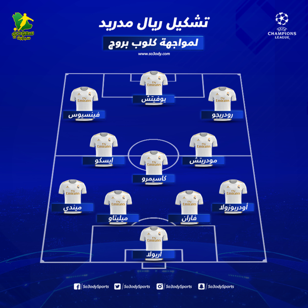 أعلن الفرنسي زين الدين زيدان المدير الفني لريال مدريد، تشكيل فريقه الأساسي الذي سيخوض به مواجهة مضيفه كلوب بروج، ضمن منافسات الجولة السادسة والأخيرة من دوري المجموعات بدوري أبطال أوروبا.