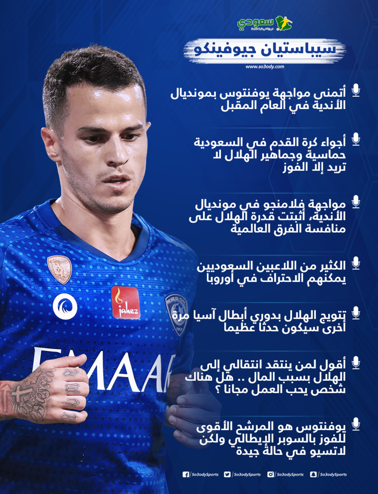 خرج الإيطالي سباستيان جيوفينكو لاعب نادي الهلال، بتصريحات مثيرة بعد مشاركته مع الفريق في كأس العالم للأندية، والتي حصل فيها الزعيم على المركز الرابع.