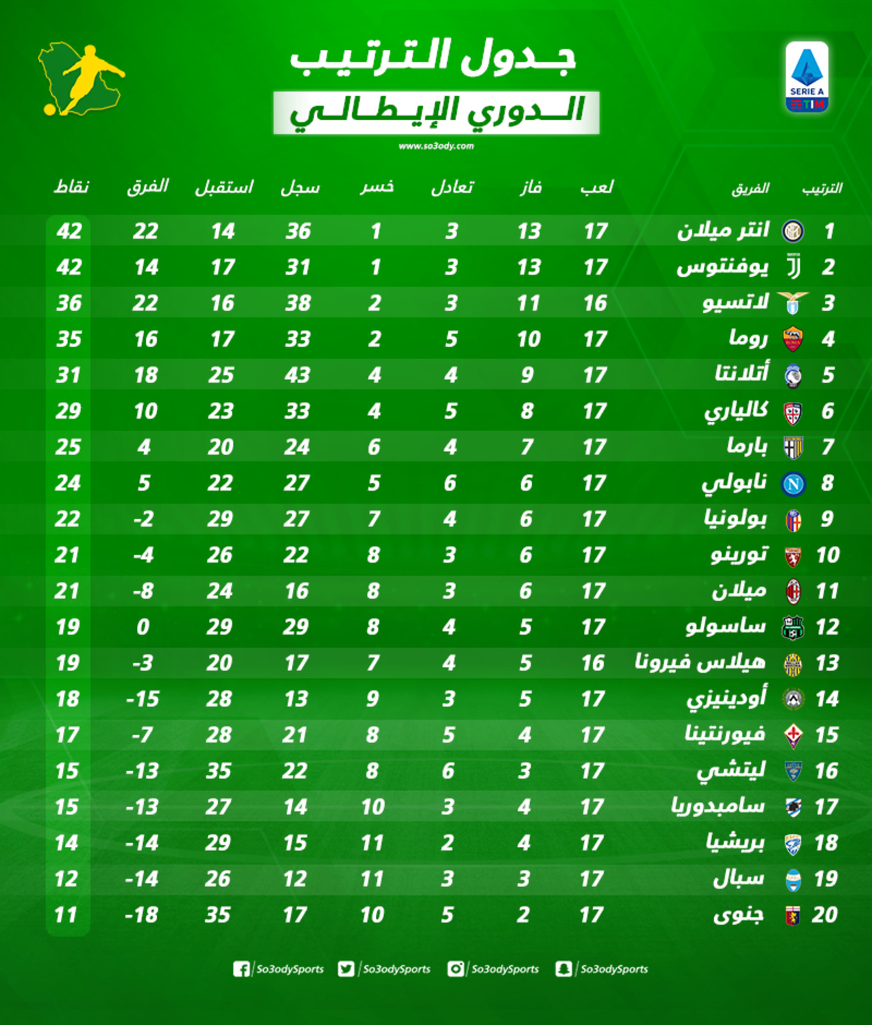 ونرصد لكم في "سعودي سبورت" بالانفوجراف، جدول ترتيب الدوري الإيطالي، بالتفصيل، كما يظهر لكم على الشاشة.