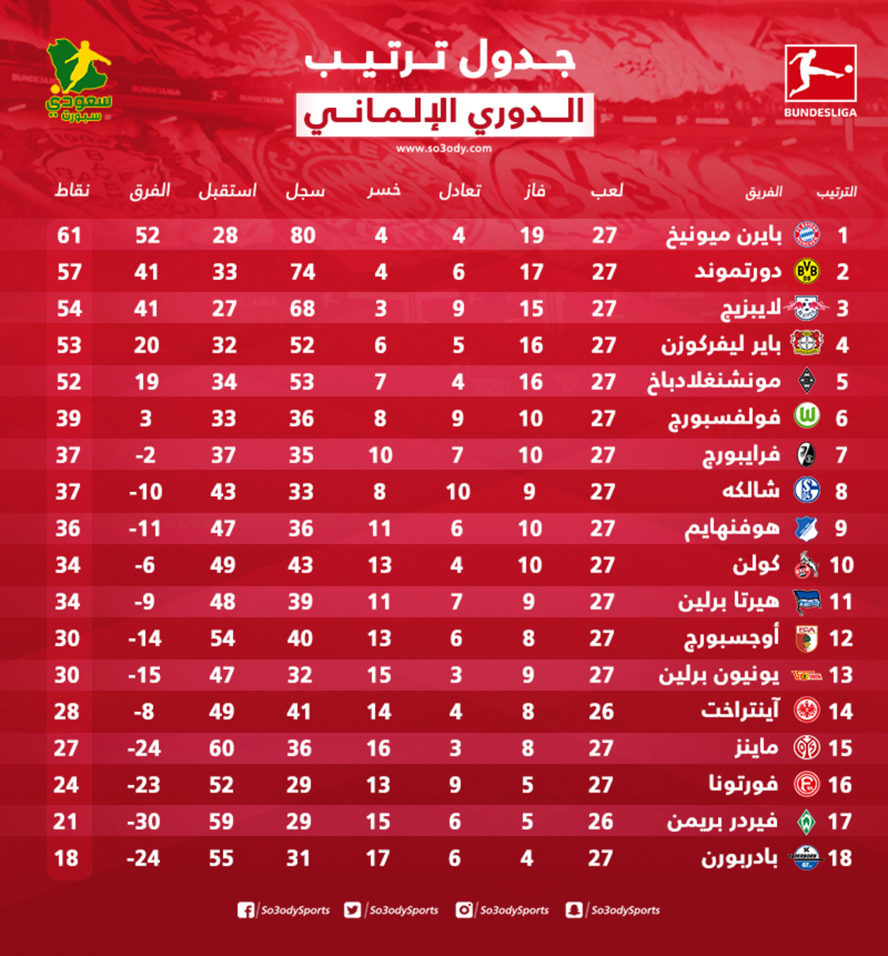 وحافظ بايرن ميونيخ على صدارة جدول الترتيب، إذ نجح في رفع رصيده إلى النقطة 61، بعد الفوز ضد آينتراخت فرانكفورت، بخمسة أهداف مقابل اثنين.