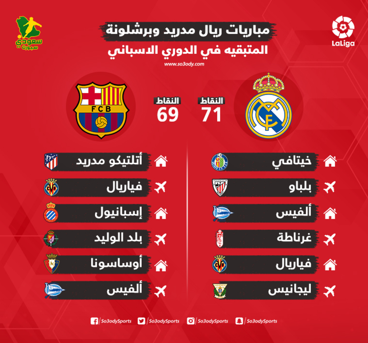 ونستعرض لكم في سعودي سبورت المباريات المتبقية لقطبي الدوري الإسباني على النحو التالي..
