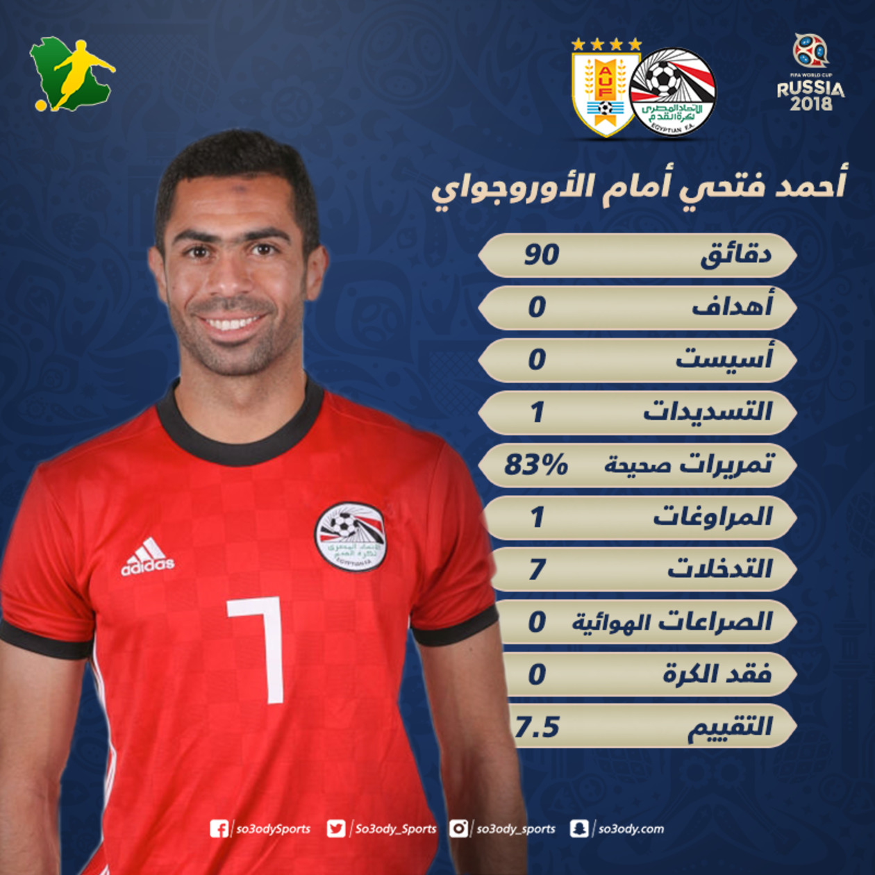 وسدد فتحي، كرة واحدة فقط، على مرمى الأوروجواي، نجح موسليرا في إنقاذها ببراعة، كما قدم تمريرات ناجحة إلى زملائه، وصلت إلى 83%.