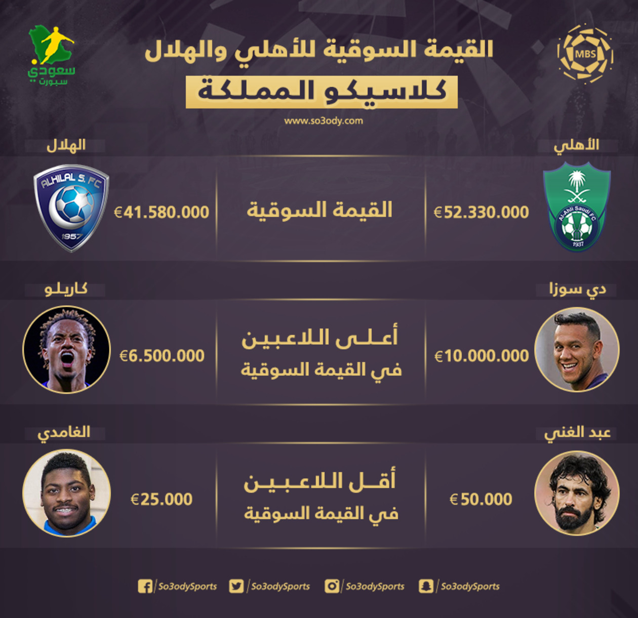 أما أقل اللاعبين قيمة مالية في الفريقين، فهو الحارس الشاب للهلال نواف الغامدي، والتي لا تتعدى قيمته الـ25 ألف يورو.