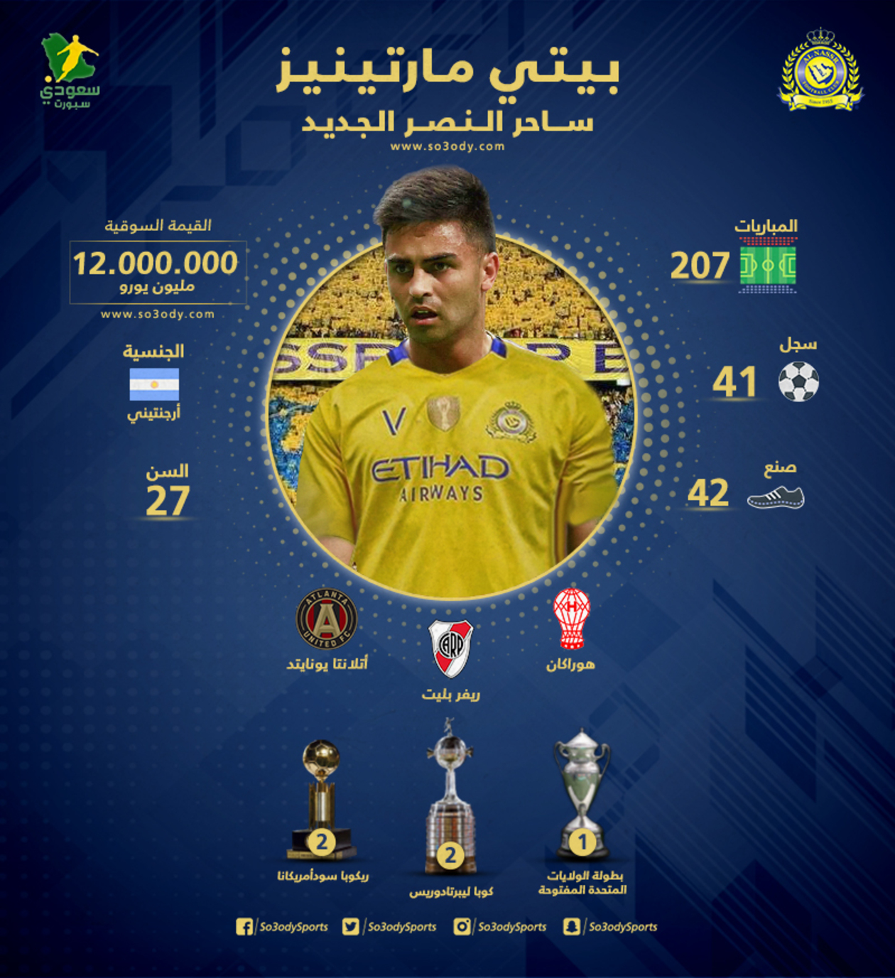 نادي النصر بصدد الإعلان عن التعاقد مع بيتي مارتينيز، لاعب نادي أتالانتا يونايتد الأمريكي، بعد حسم المفاوضات مع إدارة النادي لضم اللاعب صاحب ال 27 عاما مقابل 18 مليون يورو، حسبما أفاد دارين إيليس رئيس النادي الأمريكي.