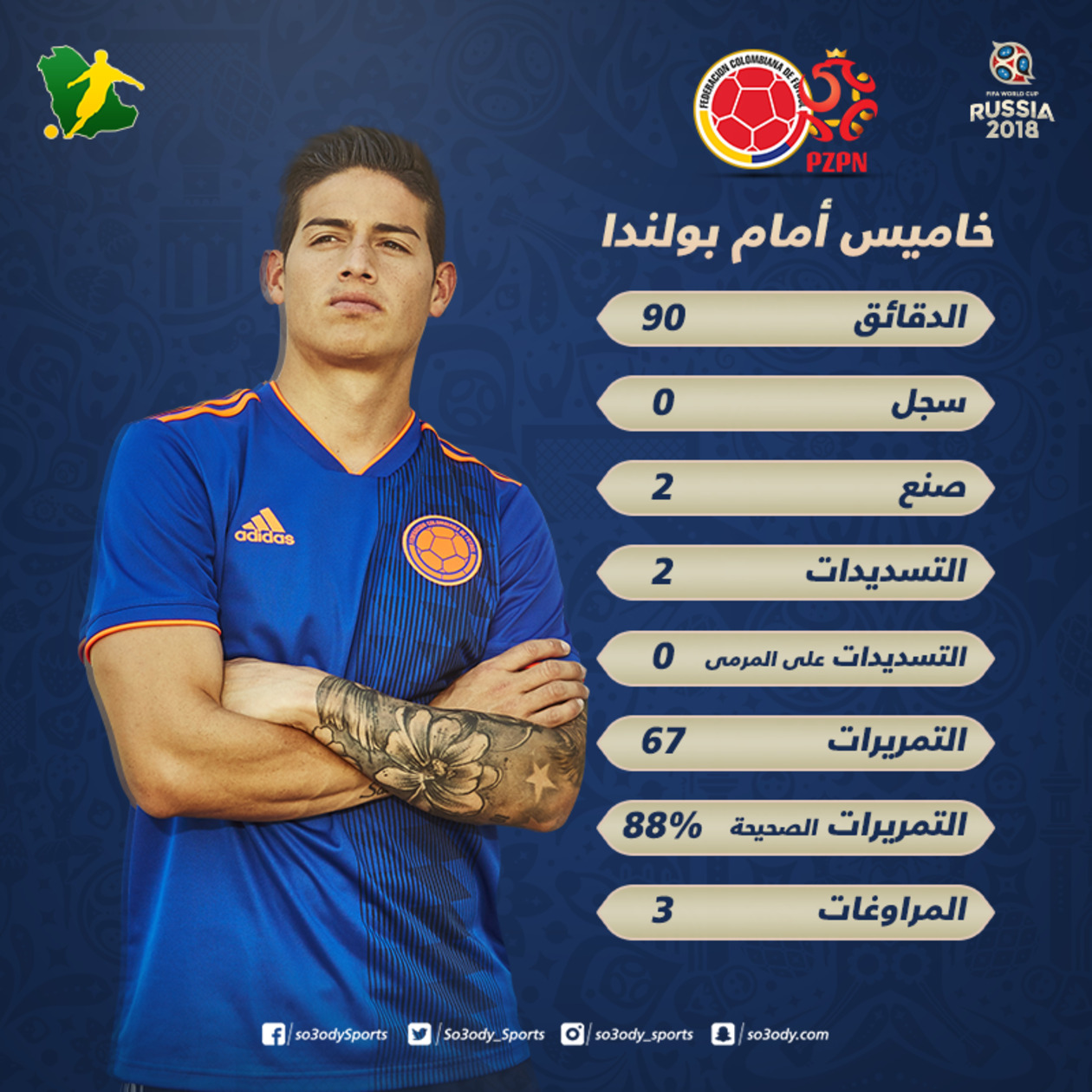 أرقام خاميس رودريجيز لم تتوقف عند هذا الحد بل أنه قام بالتسديد مرتين على مرمى بولندا، وقام بـ 67 تمريرة بنسبة نجاح وصلت إلى 88%، وهو ضمن النسب الأعلى في المباراة.