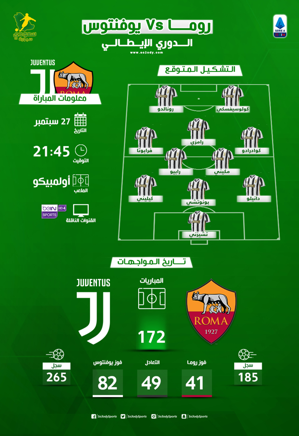 يستعد نادي يوفنتوس لملاقاة منافسه روما، في مباراة تقام بينهما بالعاصمة الإيطالية، على ملعب أولمبيكو، ضمن منافسات الجولة الثانية من الدوري الإيطالي.
