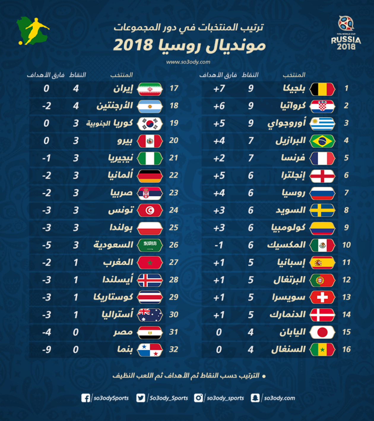 ويرصد "سعودي. كوم"، ترتيب الفرق الـ32، المشاركة في مونديال روسيا، وفقًا لنتائجها، بعد انتهاء دور المجموعات..