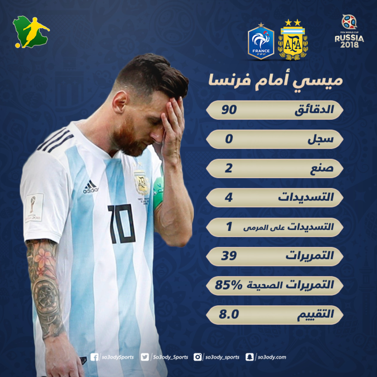 وطوال المباراة، سدد ميسي، 4 كرات صوب مرمى منتخب فرنسا، جاءت واحدة فقط بين الثلاث خشبات، بالإضافة إلى تمريره 39 كرة، إلى زملائه، بمعدل نجاح 85%.