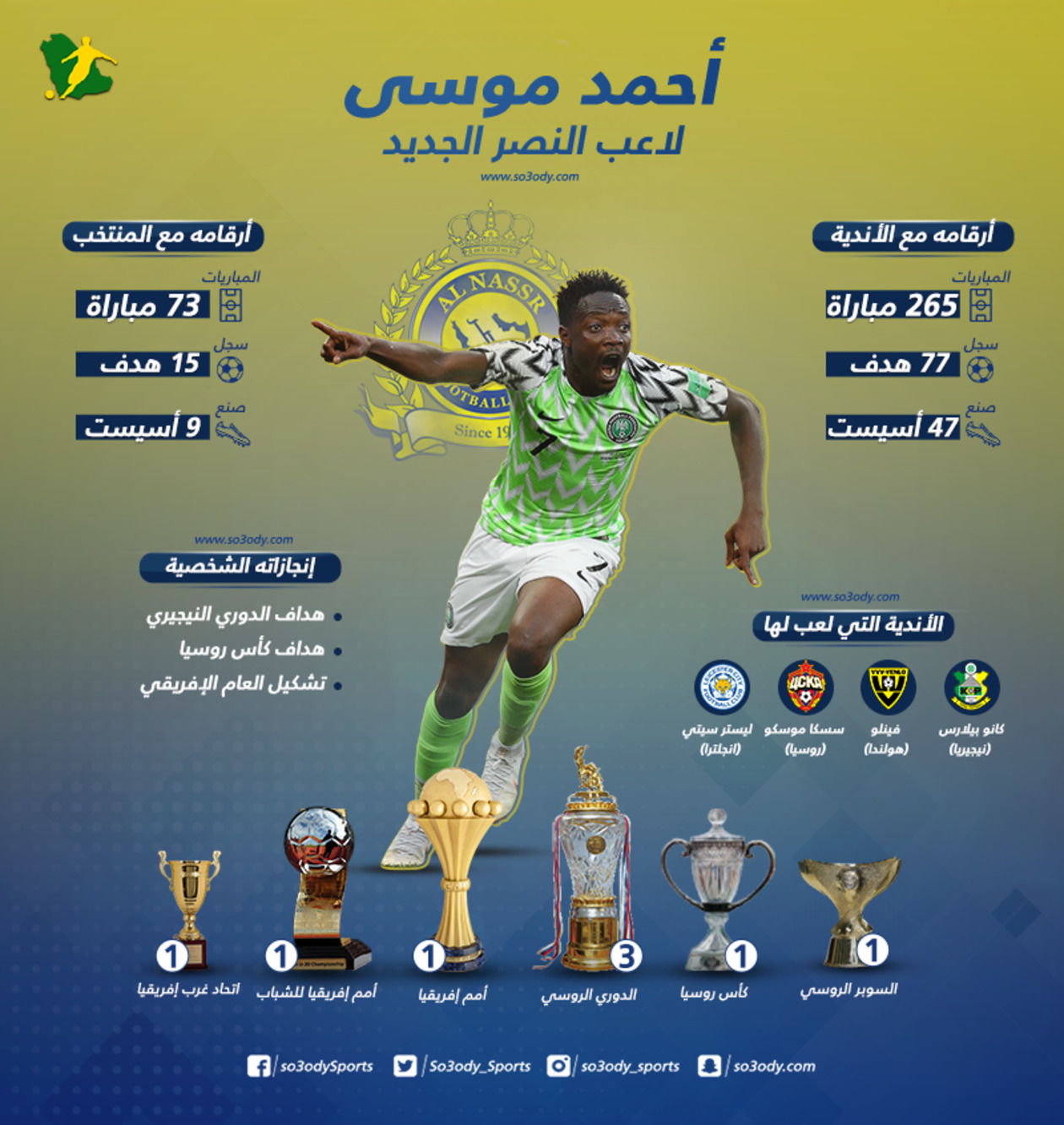 أعلن نادي النصر، في الساعات الأولى من صباح اليوم الجمعة، تعاقده رسميًا مع النيجيري أحمد موسى، جناح نادي ليستر سيتي الإنجليزي، في صفقة تاريخية، لمدة 4 مواسم قادمة.