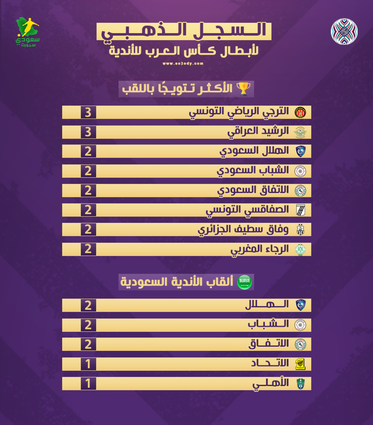يتصدر الهلال، الشباب والاتفاق، القائمة، إذ حصد الثلاثي، لقبين تاريخيين، فيما اكتفى كل من الاتحاد والأهلي، بلقب وحيد، بينما لم يحصل النصر على أي لقب عربي، طيلة تاريخه.