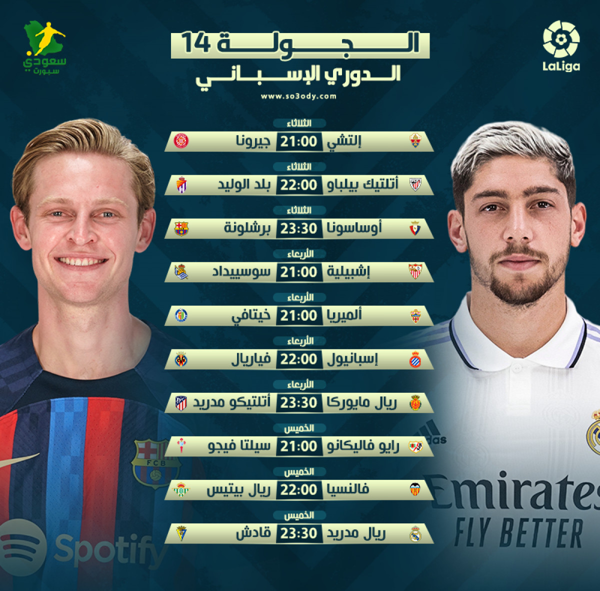 تنطلق يوم غدا الثلاثاء، منافسات الجولة الـ 14 من الدوري الإسباني "الليجا"، بمواجهة بين إلتشي وجيرونا، في افتتاح منافسات الأسبوع قبل الأخير قبل خوض منافسات كأس العالم قطر 2022.