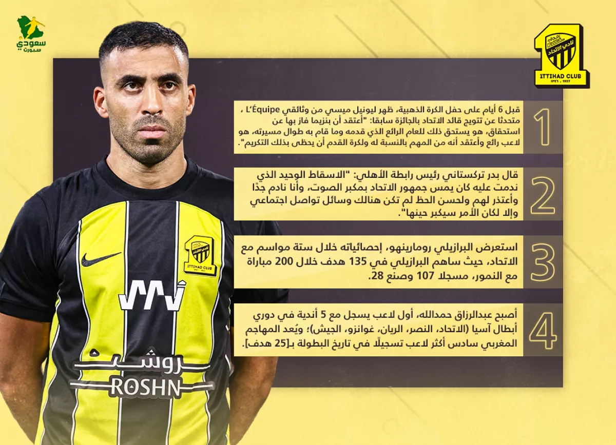 - قبل 6 أيام على حفل الكرة الذهبية، ظهر ليونيل ميسي من وثائقي L’Équipe ، متحدثا عن تتويج قائد الاتحاد بالجائزة سابقا: "أعتقد أن بنزيما فاز بها عن استحقاق، هو يستحق ذلك للعام الرائع الذي قدمه وما قام به طوال مسيرته، هو لاعب رائع وأعتقد أنه من المهم بالنسبة له ولكرة القدم أن يحظى بذلك التكريم".