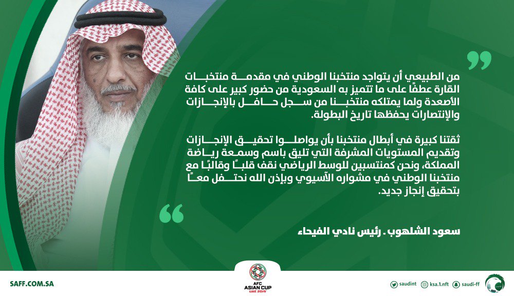 * سعود الشلهوب، رئيس نادي الفيحاء: " من الطبيعي أن يتواجد منتخبنا الوطني في مقدمة منتخبات القارة عطفًا على ما تتيمز به السعودية من حضور كبير على كافة الأصعدة ولما يمتلكه منتخبنا من سجل حافل بالإنجازات والانتصارات يحفظها تاريخ البطولة.