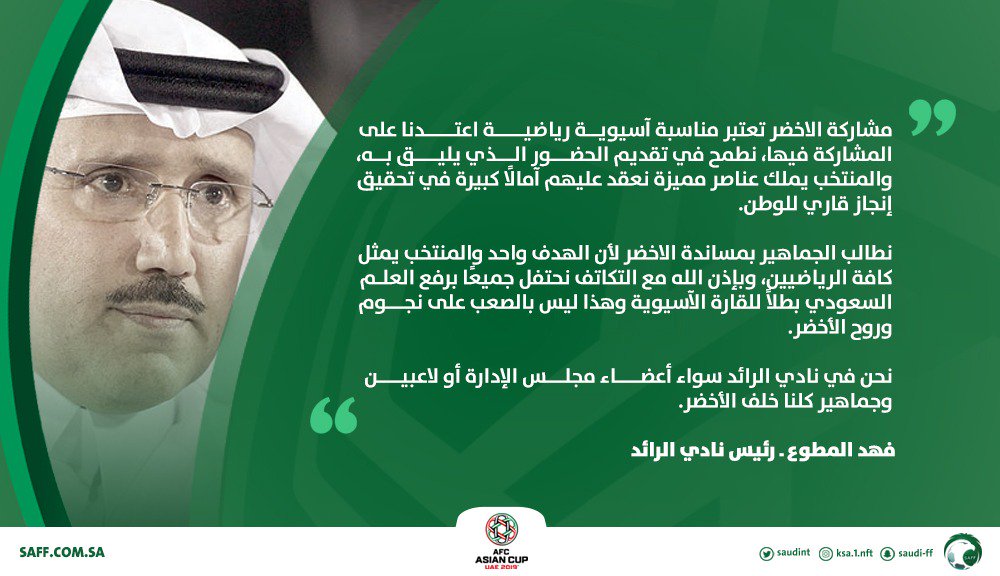 * مساعد الزامل، رئيس نادي القادسية: "المنتخب الوطني في كأس آسيا سيكون له طريقته الخاصة وأسلوبه في الملعب، وآداؤه في كأس العالم 2018 بروسيا كان بمثابة رسالة الاطمئنان على مستقبل الأخضر، ليؤكد بأنه من أقوى المنتخبات الآسيوية.