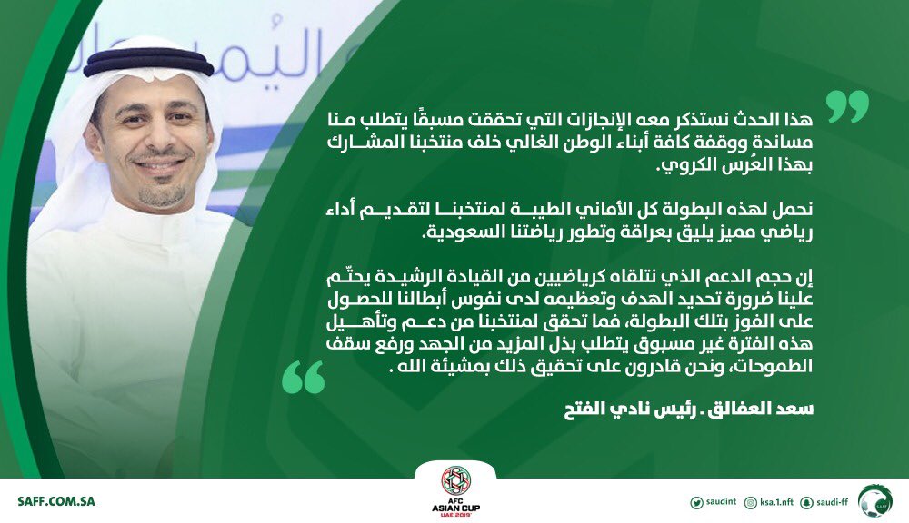 * سعد العفالق، رئيس نادي الفتح: "هذا الحدث نستذكر معه الإنجازات التي تحققت مسبقًا يتطلب منا مساندة ووقفة كافة أبناء الوطن الغالي خلف منتخبنا المشاركة بهذا العرس الكروي.