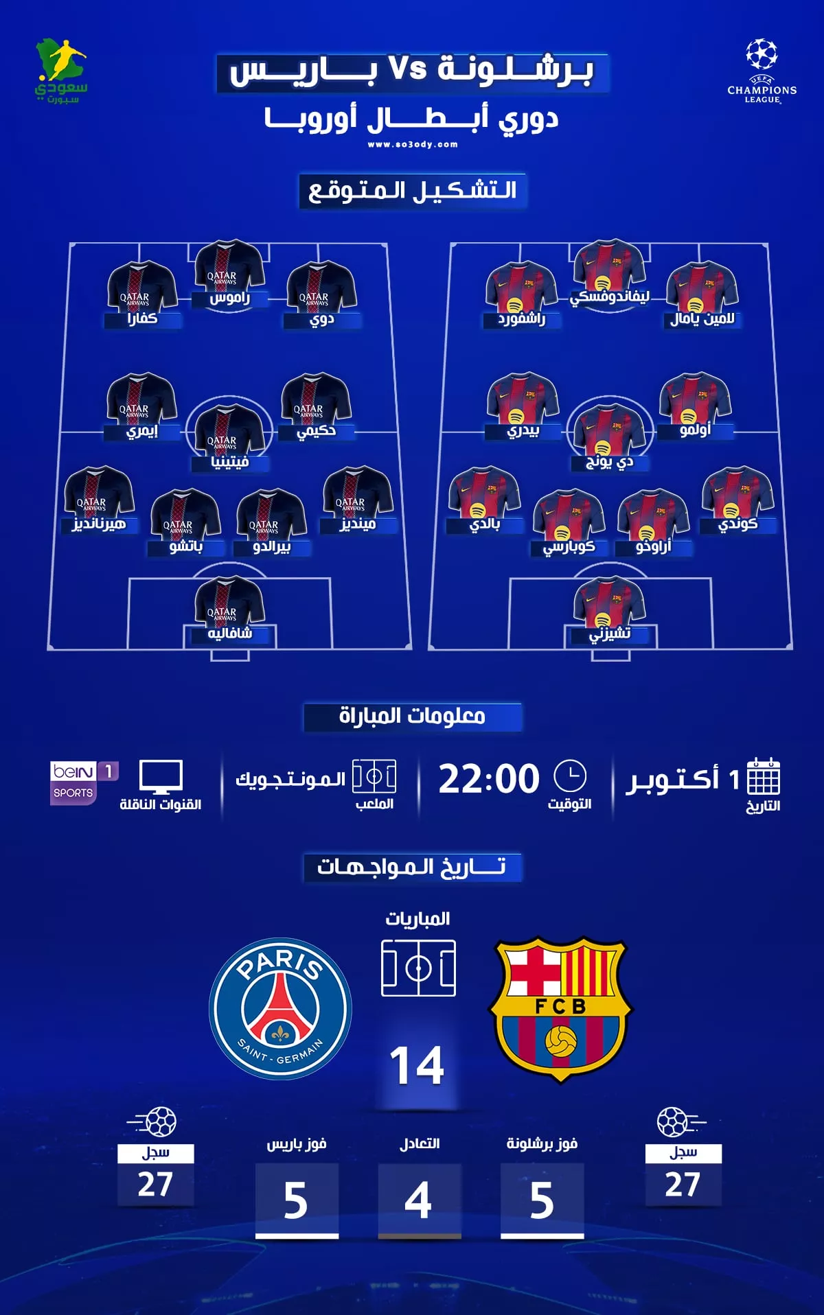 يلتقي اليوم فريق برشلونة الإسباني، نظيره باريس سان جيرمان الفرنسي، ضمن لقاءات الجولة الثانية من مرحلة الدوري المجمع لبطولة دوري أبطال أوروبا 2025-2026.