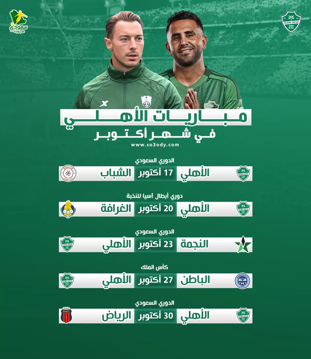 30 أكتوبر الأهلي × الرياض يتم تحديد التوقيت لاحقًا الدوري السعودي