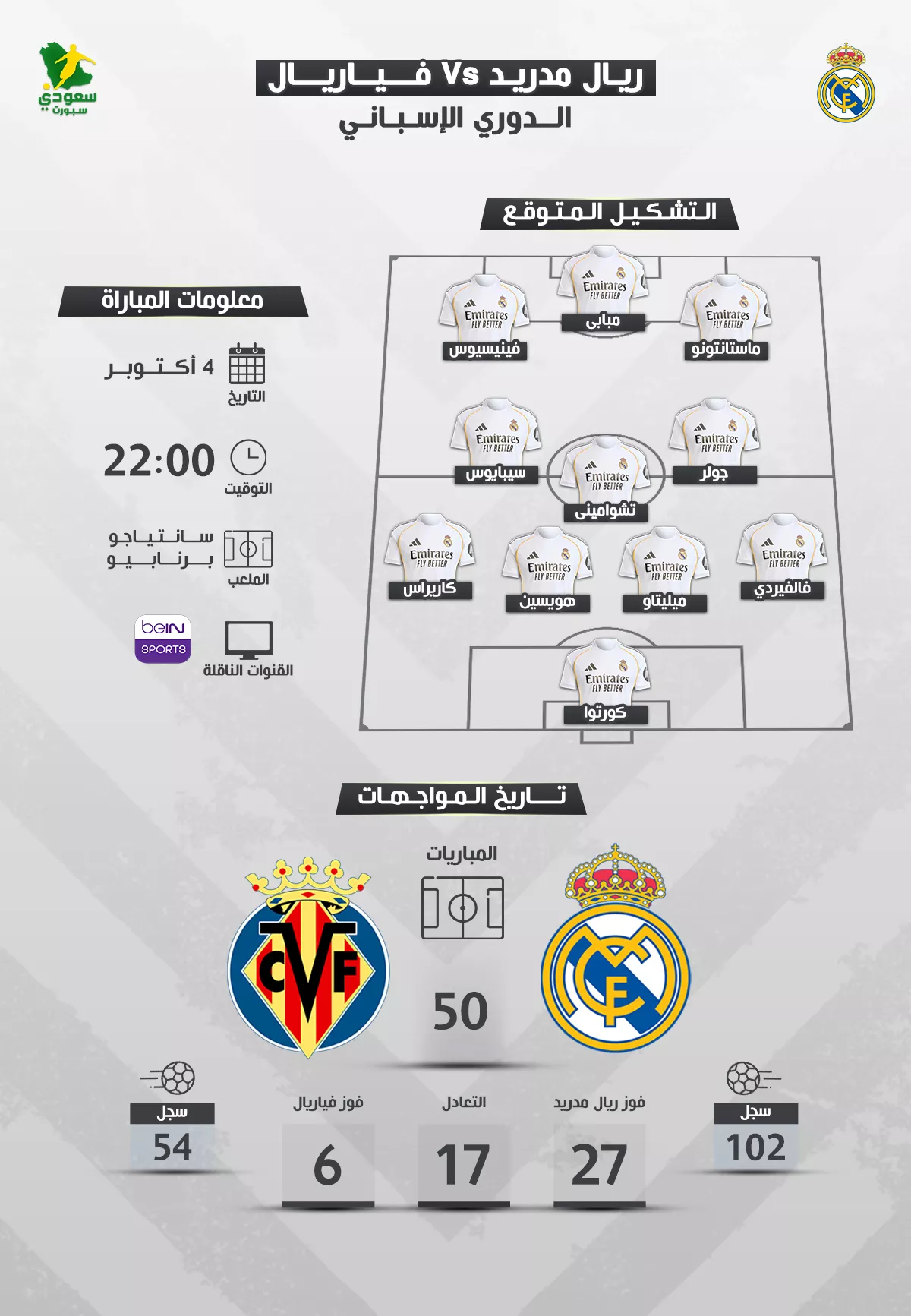 ستقام المباراة بين ريال مدريد وفياريال، مساء اليوم السبت الموافق الرابع من شهر أكتوبر لعام 2025، في تمام الساعة العاشرة مساءا بتوقيت مكة المكرمة، على ملعب سانتياجو برنابيو.