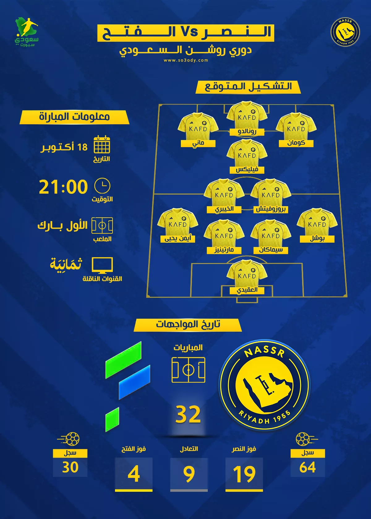 يستعد الفريق الأول لكرة القدم بنادي النصر لخوض مباراة غاية في القوة ضد نادي الفتح ضمن الجولة الخامسة من منافسات دوري روشن السعودي.