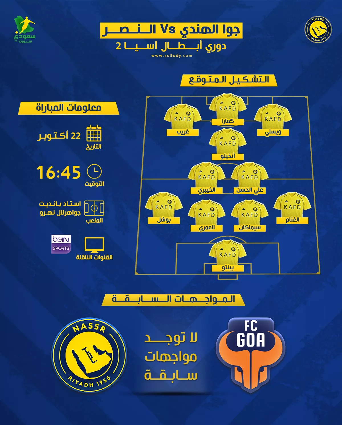 يستعد الفريق الأول لكرة القدم في نادي النصر السعودي، لمواجهة مثيرة عندما يحل ضيفا على فريق غوا الهندي، ضمن لقاءات الجولة الثالثة من دور المجموعات من بطولة دوري أبطال آسيا 2.