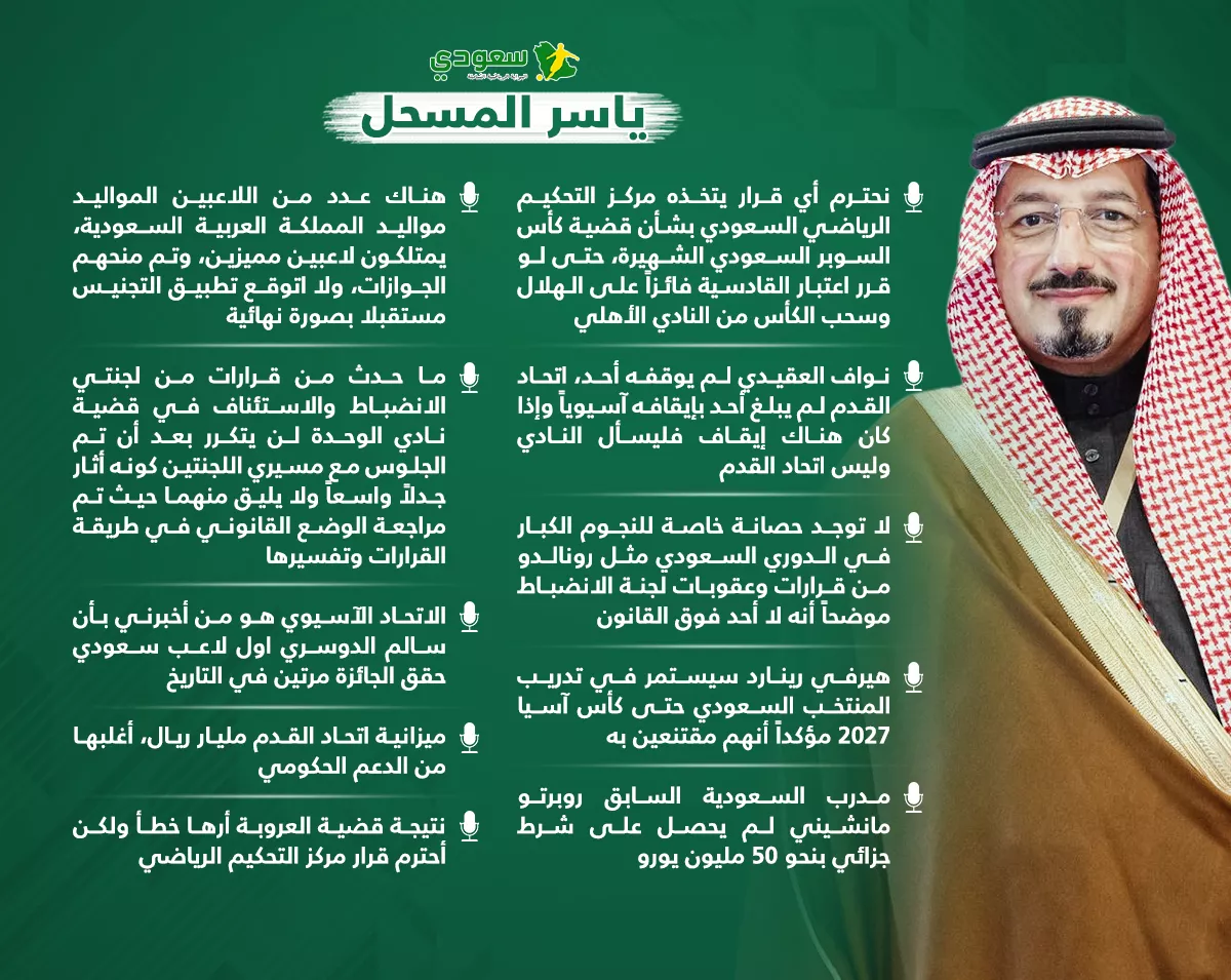 - نحترم أي قرار يتخذه مركز التحكيم الرياضي السعودي بشأن قضية كأس السوبر السعودي الشهيرة، حتى لو قرر اعتبار القادسية فائزًا على الهلال، وسحب الكأس من النادي الأهلي.