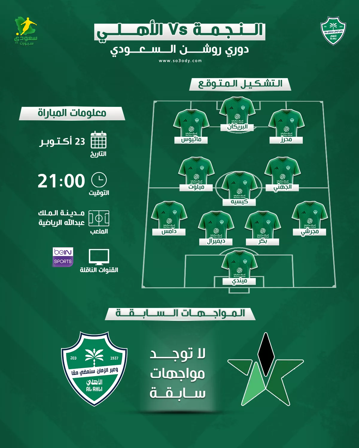 يحل الأهلي ضيفا على النجمة مساء الخميس الموافق 23 أكتوبر 2025، ضمن لقاءات الجولة السادسة من دوري روشن السعودي للمحترفين.