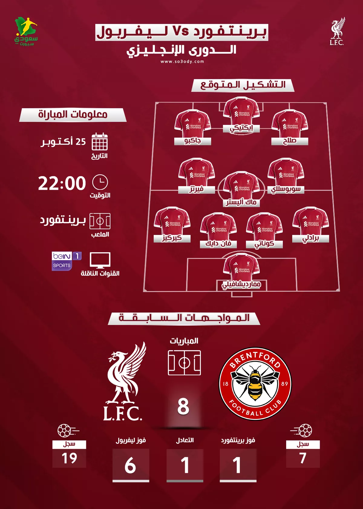 يحل ليفربول ضيفًا على فريق برينتفورد، مساء غد السبت، في تمام الساعة العاشرة مساءً، ضمن منافسات الجولة التاسعة من الدوري الإنجليزي الممتاز، في مواجهة يسعى من خلالها الريدز لاستعادة توازنه بعد ثلاث هزائم متتالية في البريميرليج ، أملًا في العودة إلى طريق الانتصارات ومواصلة الضغط على فرق المقدمة.
