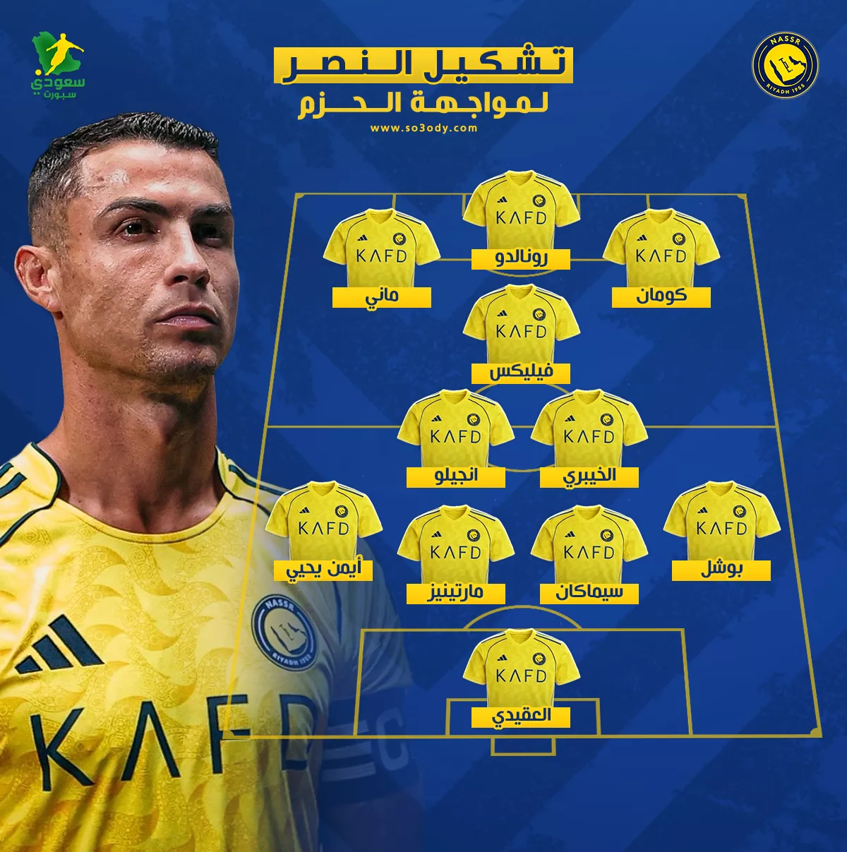 أعلن المدير الفني البرتغالي خورخي خيسوس تشكيل نادي النصر السعودي ضد خصمه الحزم، ضمن منافسات الجولة السادسة من بطولة دوري روشن للمحترفين.