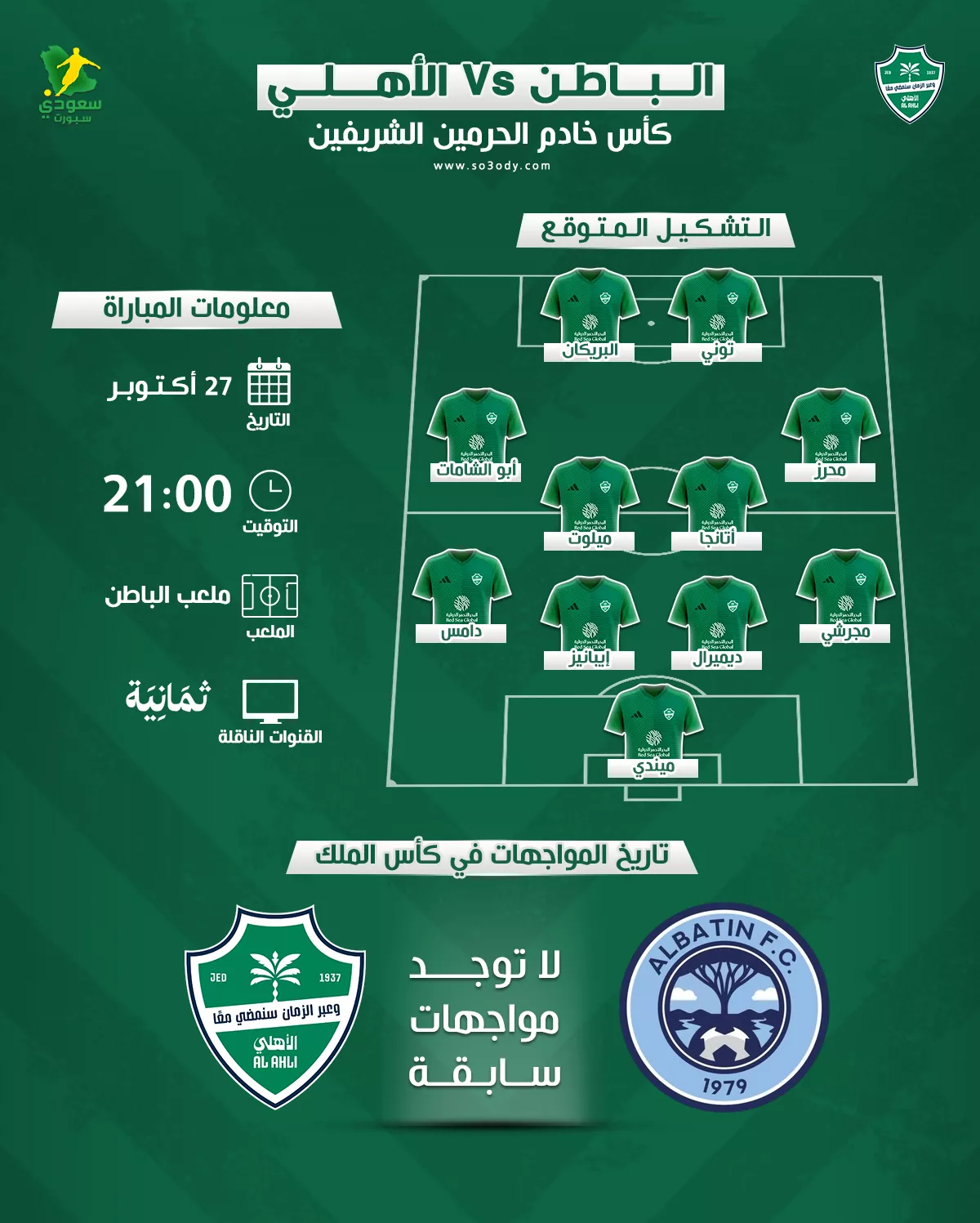 ويلعب الأهلي ضد الباطن غدًا في تمام التاسعة مساءً بتوقيت مكة المكرمة، على ملعب الباطن.