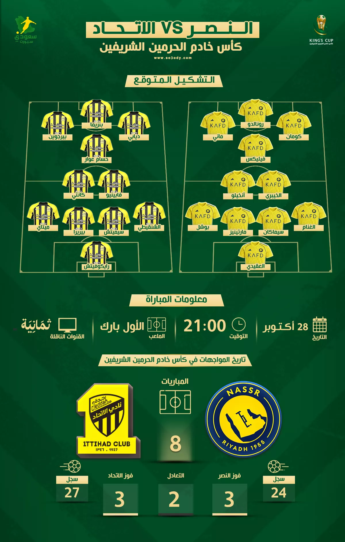 يستعد الفريق الأول لنادي النصر السعودي لكرة القدم لمواجهة خصمه نادي الاتحاد، ضمن منافسات دور الـ 16 من بطولة كأس خادم الحرمين الشريفين.
