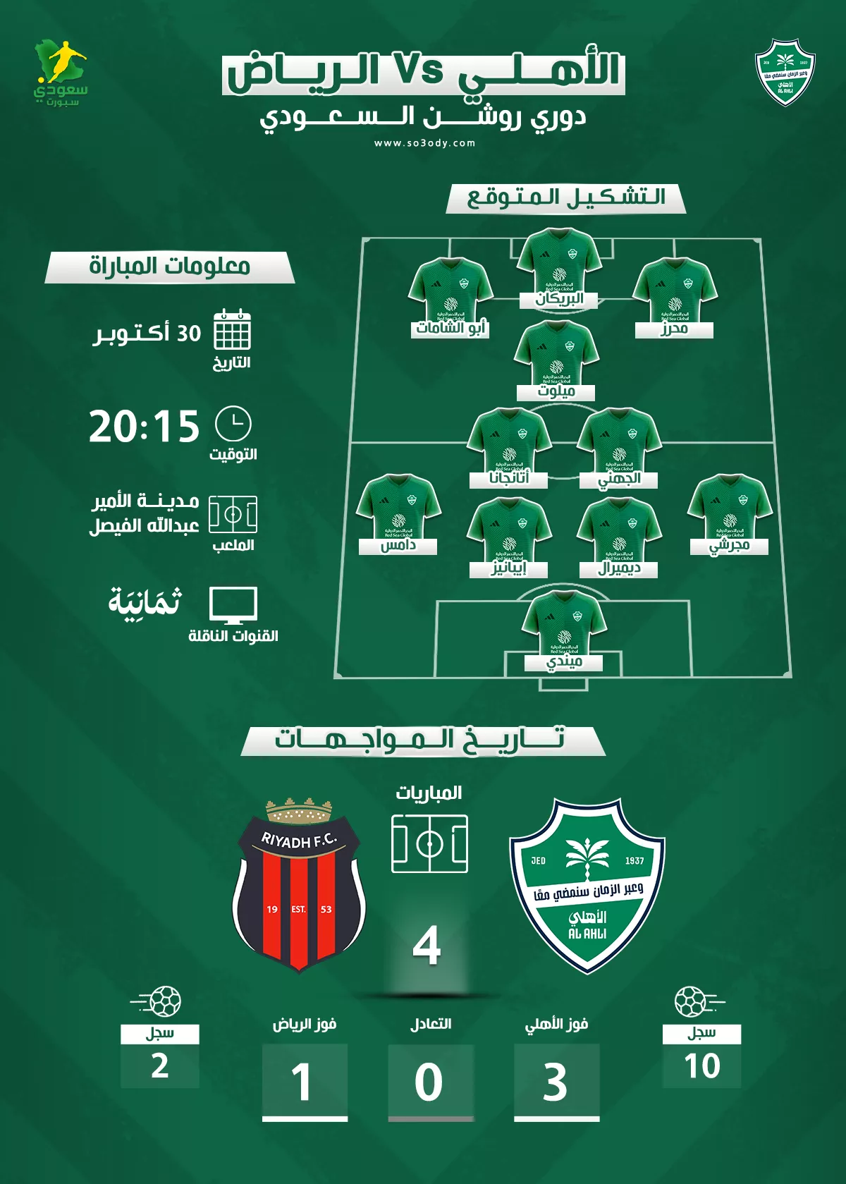 يستضيف الأهلي نظيره الرياض ضمن لقاءات الجولة 7 من دوري روشن مساء الخميس الموافق 30 أكتوبر 2025، على ملعب مدينة الأمير عبد الله الفيصل "جدة".