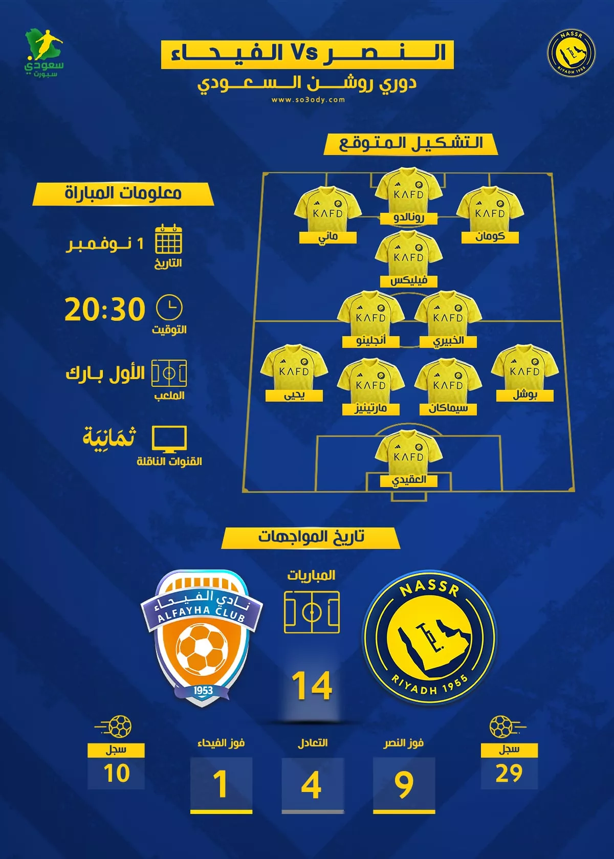 ويبحث النصر بقيادة مدربه البرتغالي خورخي خيسوس عن تحقيق الفوز وحصد النقاط الثلاث، بينما يدخل الفيحاء المواجهة بطموح الخروج بنتيجة إيجابية أمام أحد أقوى فرق البطولة.