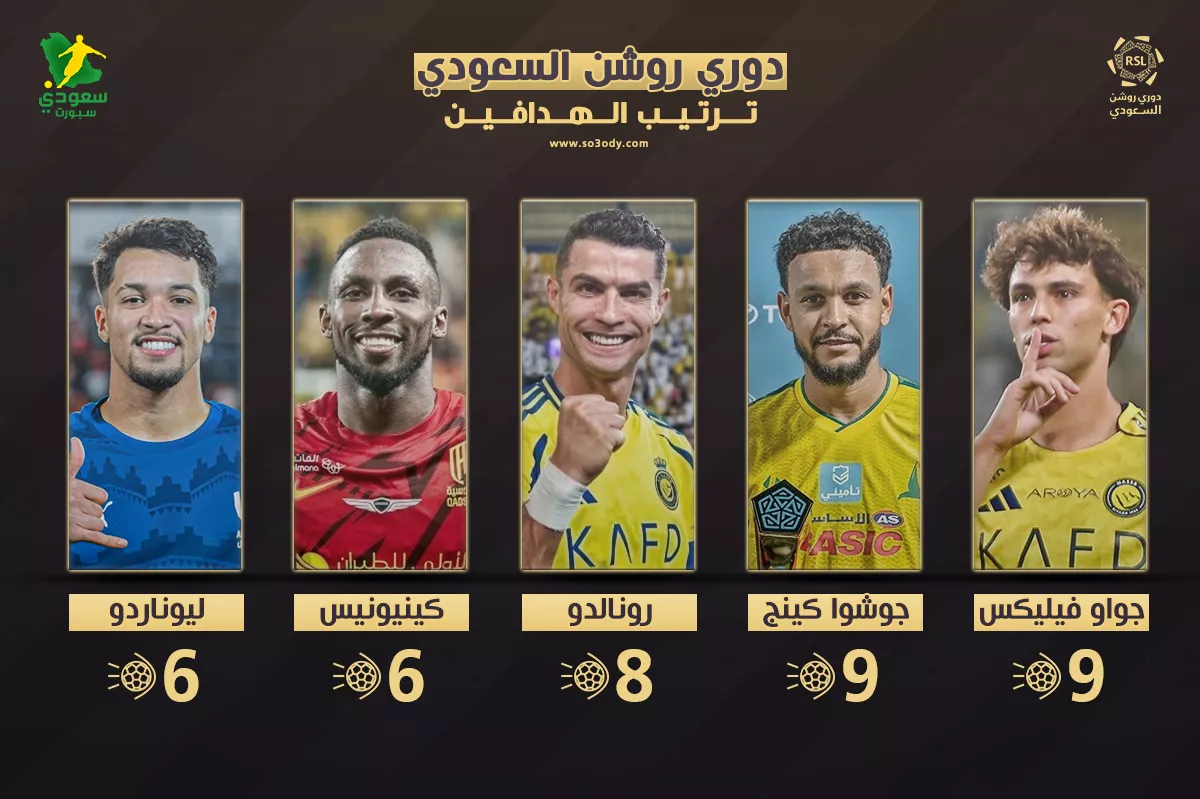 وفي المركز الثالث وبنفس رصيد كينج، يأتي رونالدو نجم النصر، وخلفه كينونيس نجم القادسية وليوناردو هداف الهلال برصيد 6 أهداف.