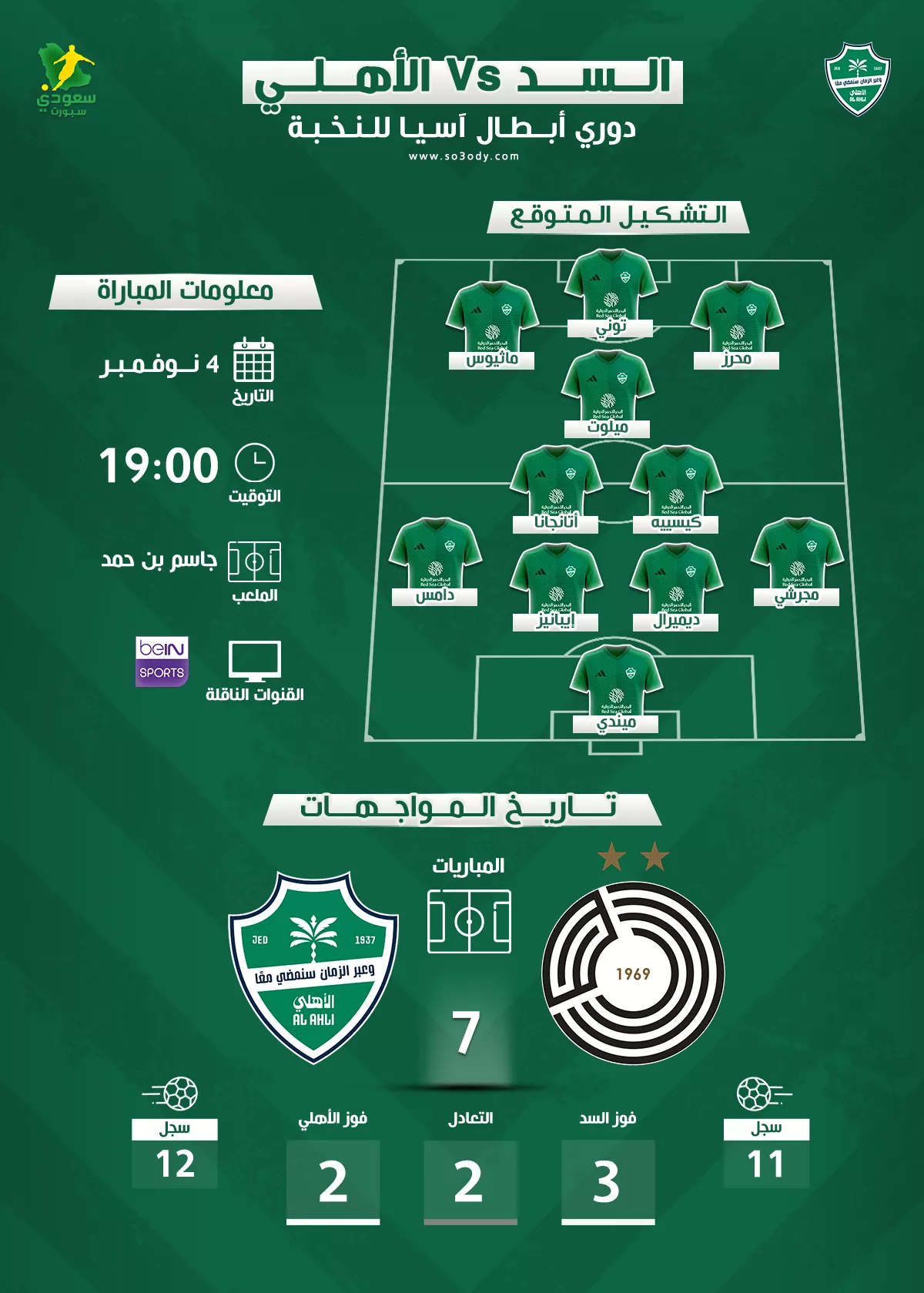 يستعد الفريق الأول لكرة القدم في الأهلي، لمواجهة هامة عندما يحل ضيفا على السد القطري، ضمن لقاءات الجولة الرابعة من دوري المجموعات من نخبة آسيا.