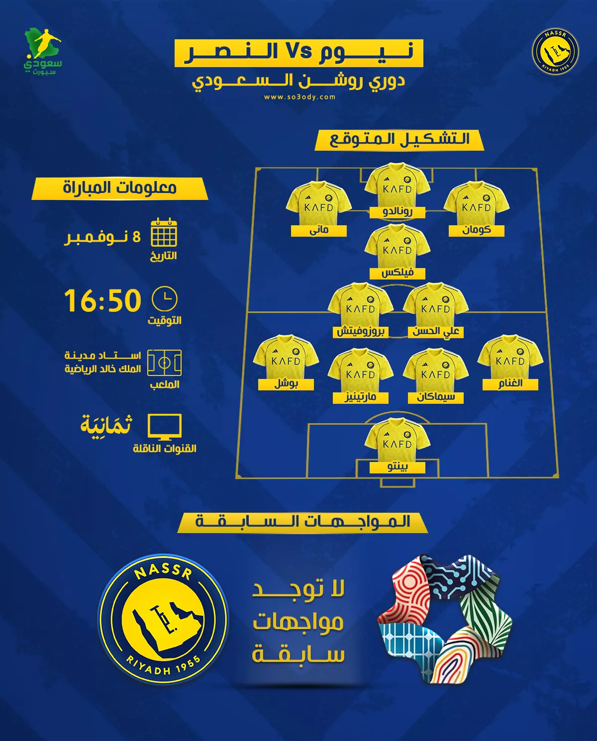 ويحل النصر ضيفًا على نيوم، باستاد مدينة الملك خالد الرياضية، ضمن منافسات الجولة الثامنة من دوري روشن.