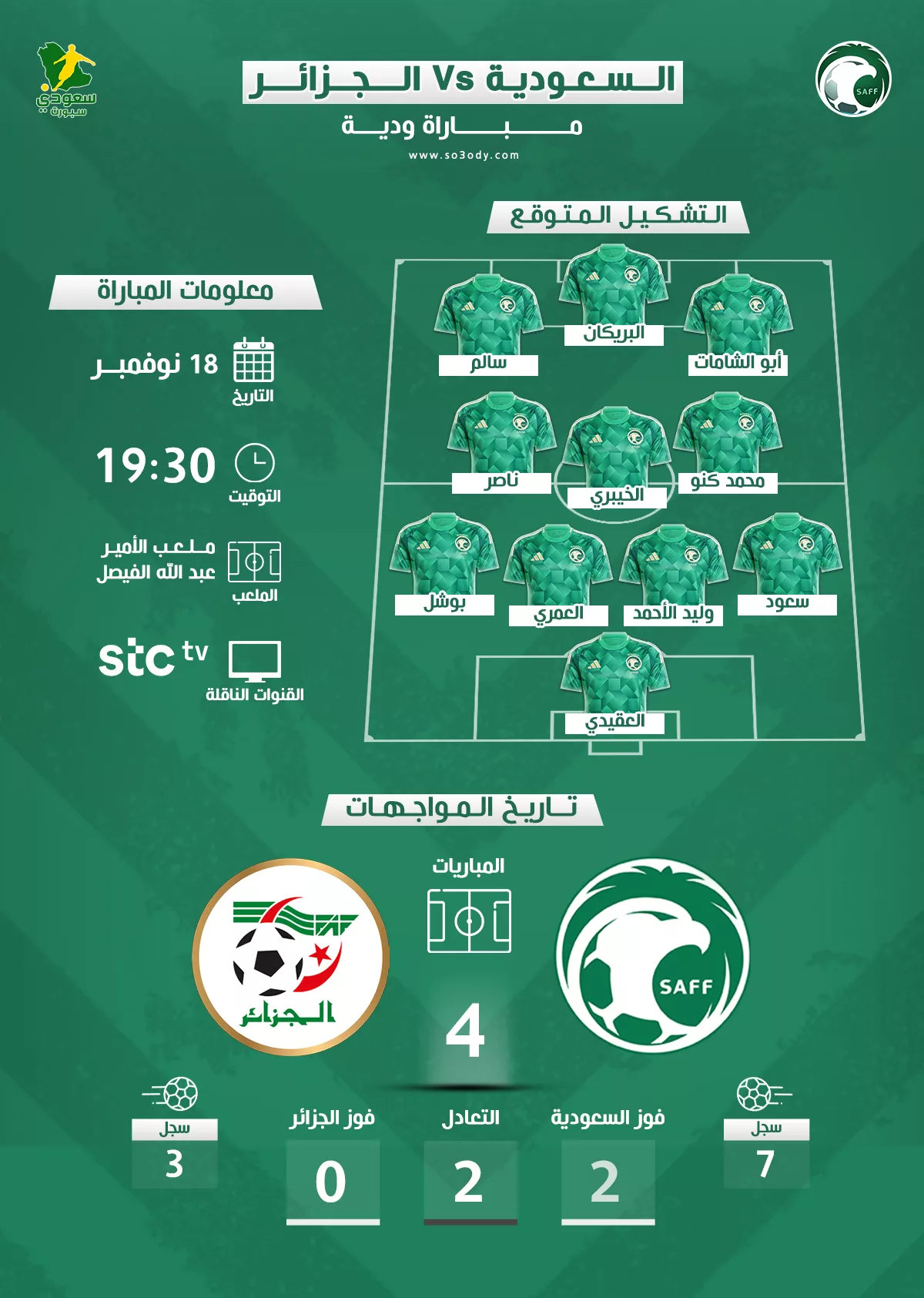 يستعد منتخب السعودية الأول تحت قيادة الفرنسي هيرفي رينارد، لثاني مواجهاته الودية خلال توقف نوفمبر، عندما يستضيف الجزائر، على ملعب مدينة الأمير عبدالله الفيصل في جدة.