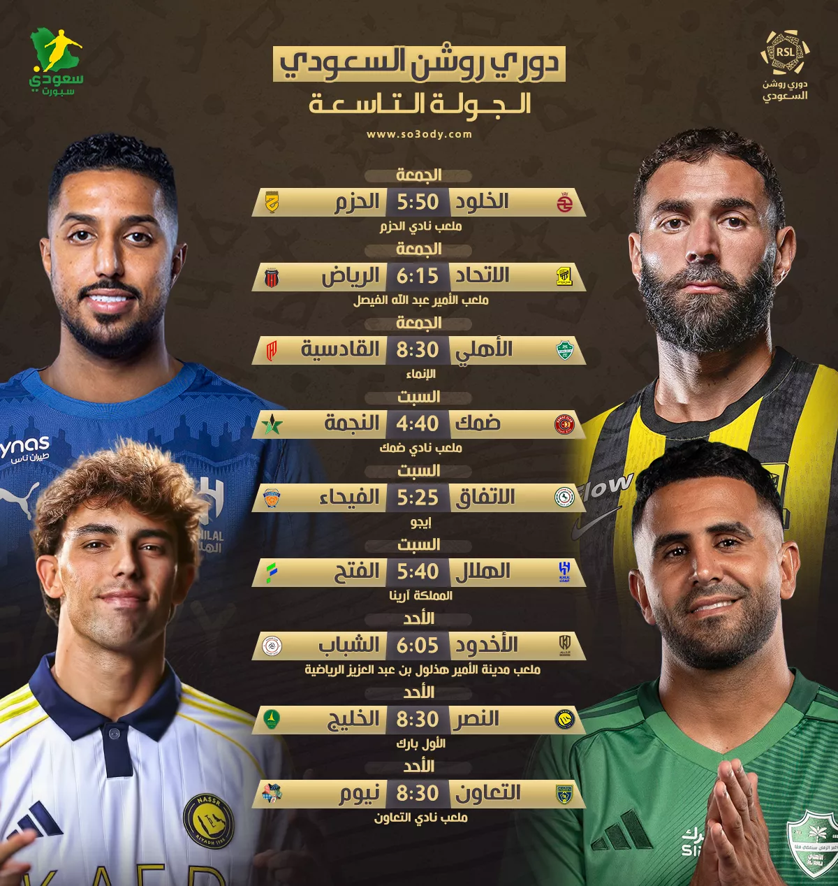 جدول مواعيد مباريات الجولة التاسعة من دوري روشن والقنوات الناقلة