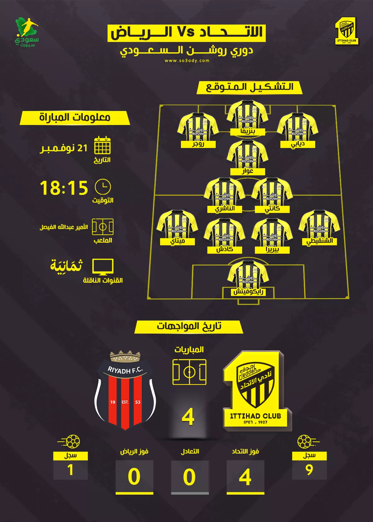 يستضيف الاتحاد تحت قيادة مدربه البرتغالي سيرجيو كونسيساو، فريق الرياض الذي يلعب تحت قيادة فنية جديدة للأورجواياني كارينيو، في الجولة التاسعة من دوري روشن للمحترفين.