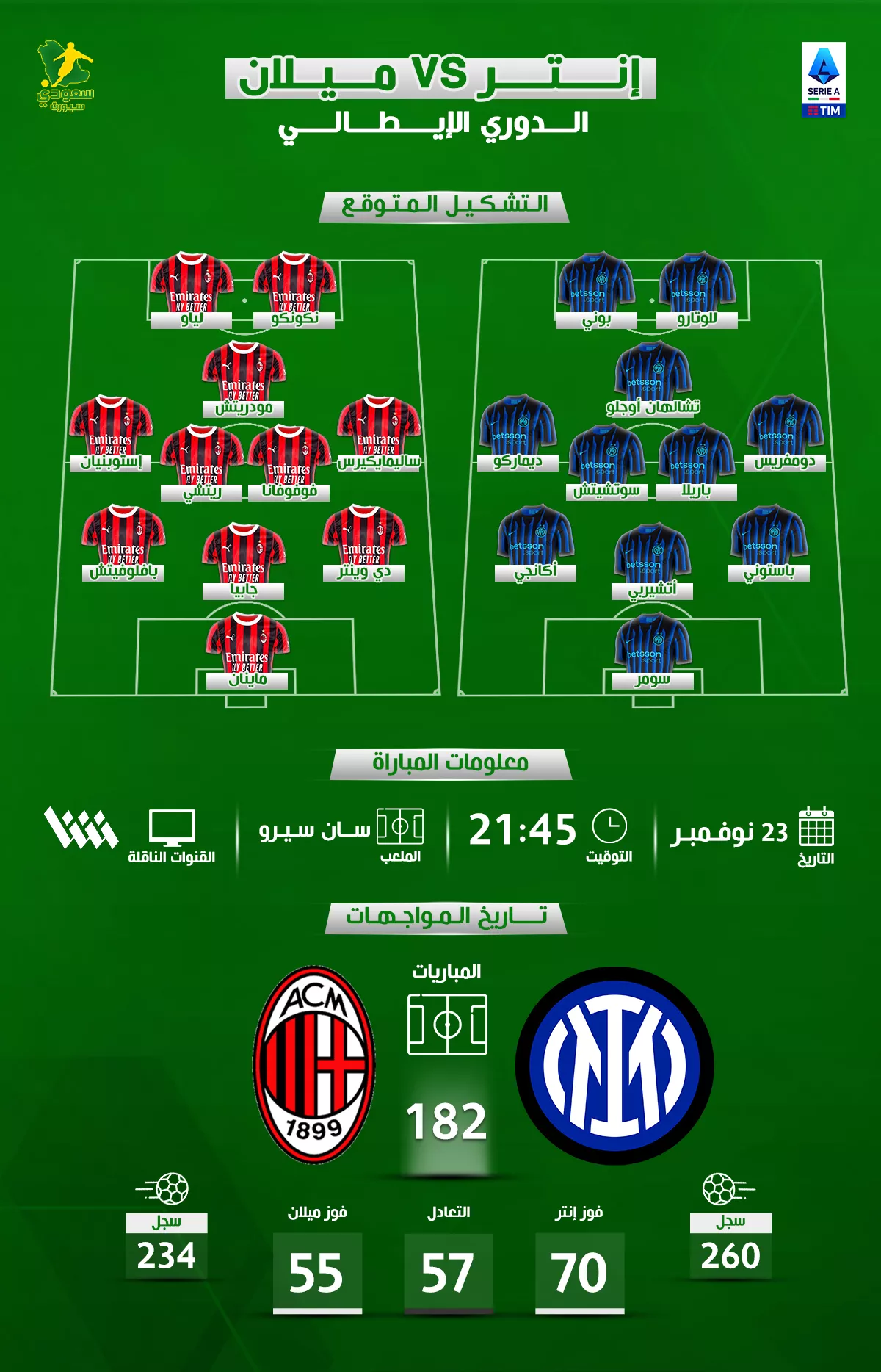وتنطلق مباراة إنتر ميلان، ضد ميلان في العاشرة إلا ربع مساءً، وتنقل تليفزيونيًا عبر منصة شاشة.