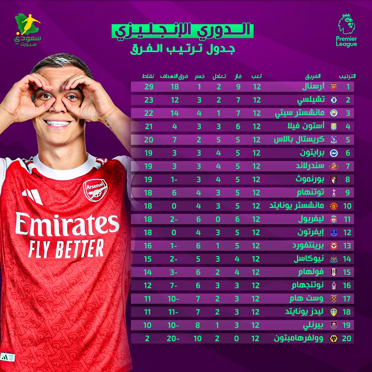 شهدت الجولة الـ 12 من الدوري الإنجليزي الممتاز إثارة كبيرة وتقلبات غير متوقعة، بعدما سقطت معظم فرق القمة في نتائج مخيبة، لتتحول الجولة إلى واحدة من أكثر المراحل المفاجئة هذا الموسم، بينما كان أرسنال الفريق الوحيد الذي خرج سالمًا من فخ الهزائم.