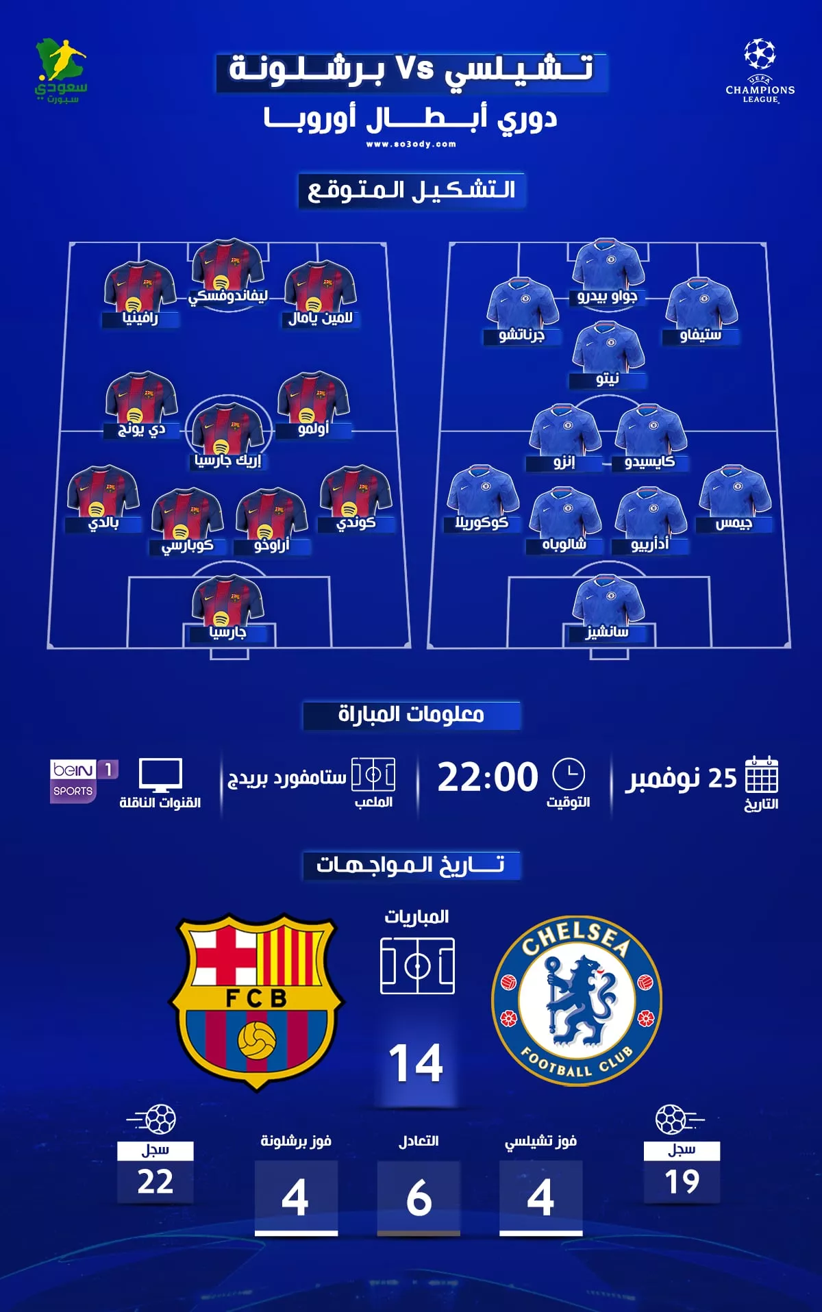 يحل فريق برشلونة الإسباني، ضيفًا على نظيره تشيلسي الإنجليزي، في مرحلة الدوري المجمع لبطولة دوري أبطال أوروبا.