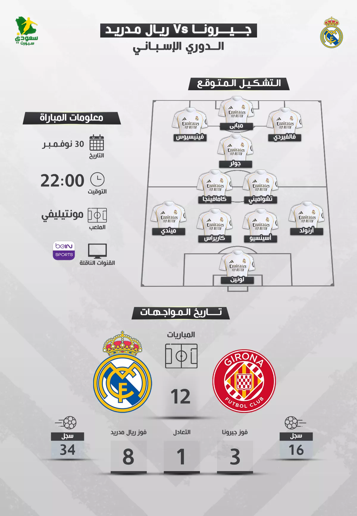 ويُشار إلى أن ريال مدريد يدخل اللقاء بسلسلة انتصارات متتالية أمام جيرونا بلغت أربع مباريات في جميع المسابقات، محافظاً على شباكه نظيفة خلال هذه السلسلة.