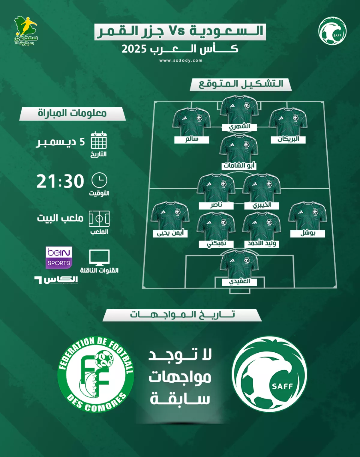 القنوات الناقلة لمباراة السعودية وجزر القمر في كأس العرب