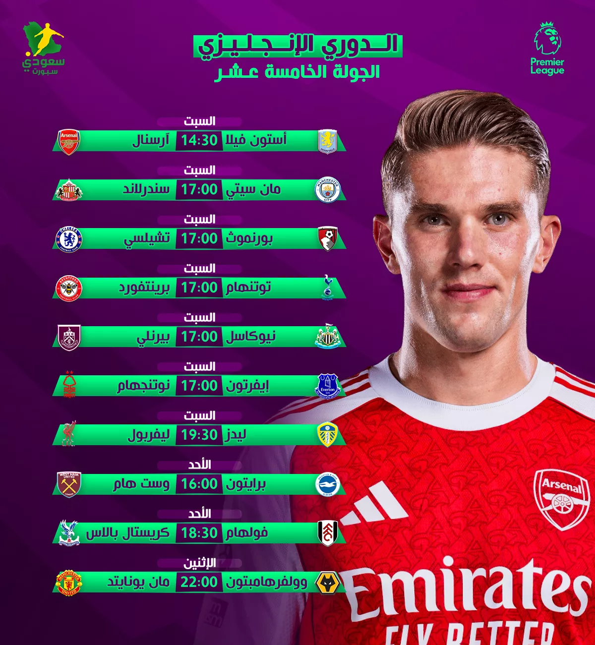 وتنقل مباريات الجولة الـ 15 من الدوري الإنجليزي تليفزيونيًا عبر شبكة قنوات BeIN sport الناقل الحصري للدوري الإنجليزي في الشرق الأوسط