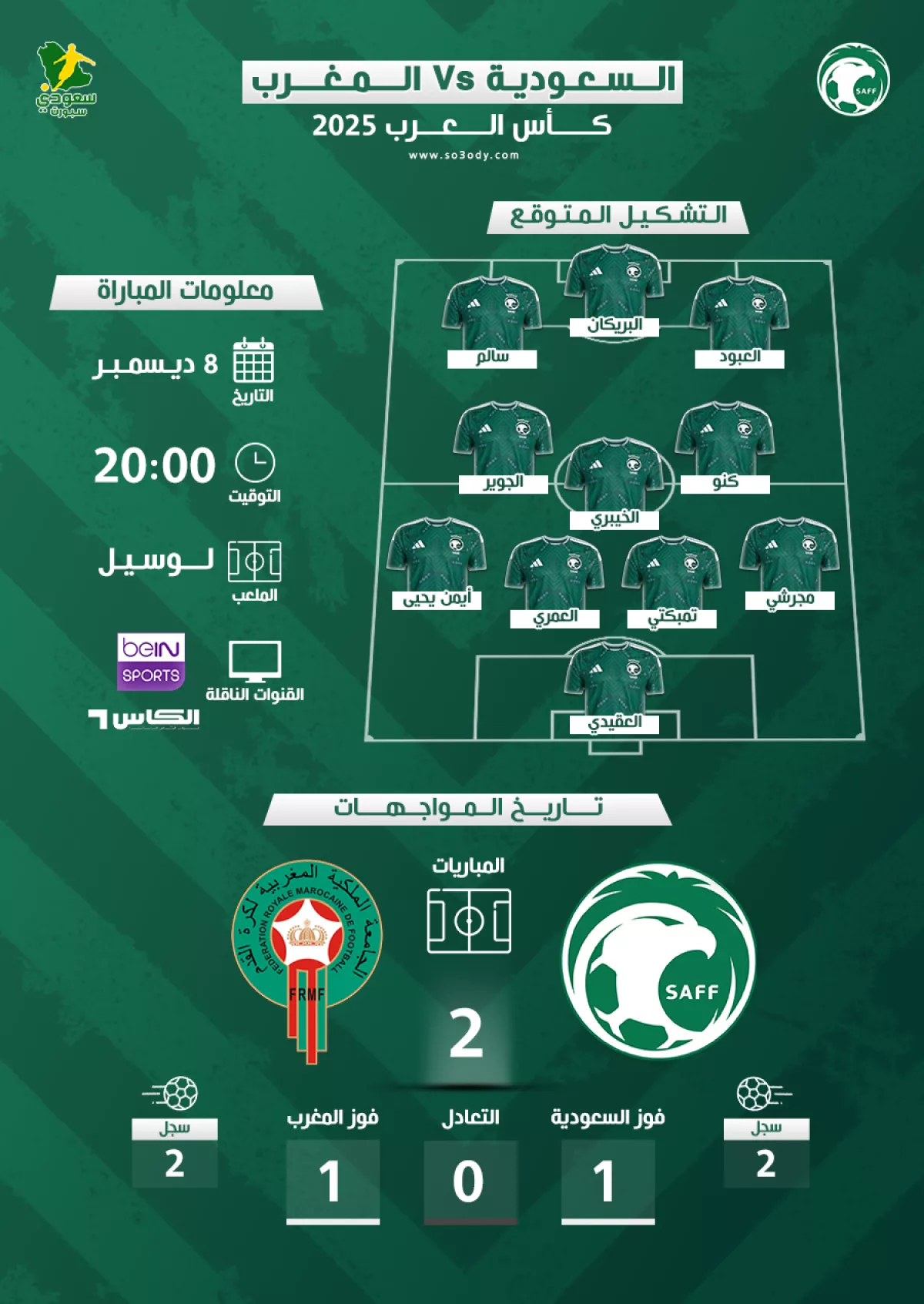 تستعد السعودية لمواجهة المغرب في الجولة الثالثة من منافسات المجموعة الثانية ببطولة كأس العرب، والتي ستقام يوم الثامن من ديسمبر على ملعب لوسيل.