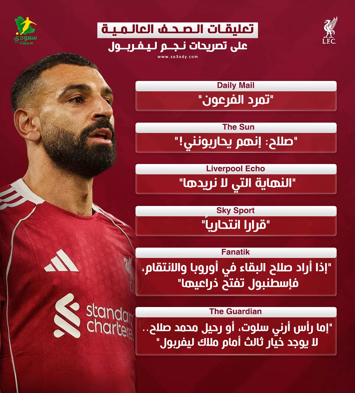 صحيفة "ليفربول إيكو" (Liverpool Echo): المقربة من النادي، عكست حزن الجماهير بعنوان: "النهاية التي لا نريدها". التقرير أشار إلى أن الجماهير تصب غضبها بالكامل على المدرب الهولندي أرني سلوت، مطالبة الإدارة بإقالته فوراً في اجتماع الغد لإنقاذ ما يمكن إنقاذه والإبقاء على صلاح، مع تداول اسم "ستيفن جيرارد" بقوة كمنقذ محتمل في الصحيفة.