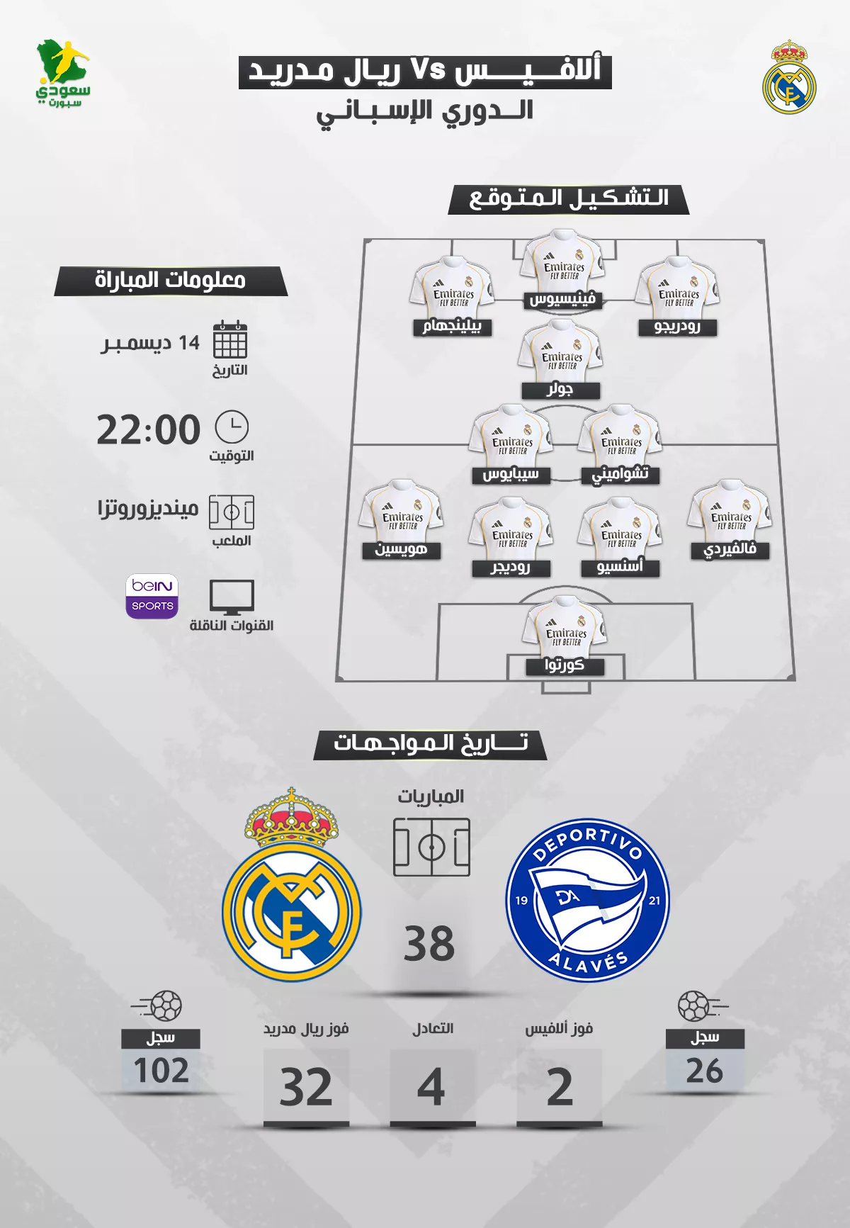 يحل فريق ريال مدريد، ضيفًا على نظيره ألافيس، ضمن لقاءات بطولة الدوري الإسباني "الليجا" بالموسم الجاري 2025-2026.