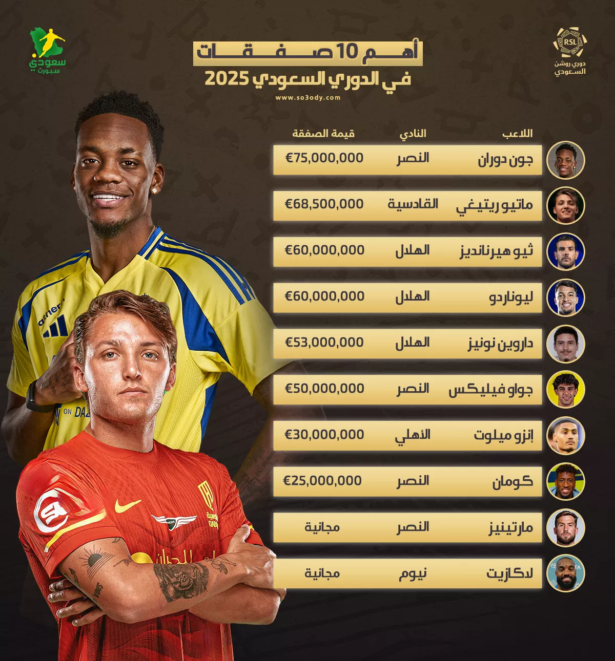 وتصدر نادي النصر قائمة الإنفاق بـ عرضًا خياليًا لضم المهاجم الكولومبي جون دوران من أستون فيلا بصفقة بلغت 75 مليون يورو، ليكون دوران رهانًا هجوميًا ضخماً يطمح من خلاله "العالمي" لفرض سيطرته المطلقة، لكن سرعان ما رحل سريعًا إلى الدوري التركي.
