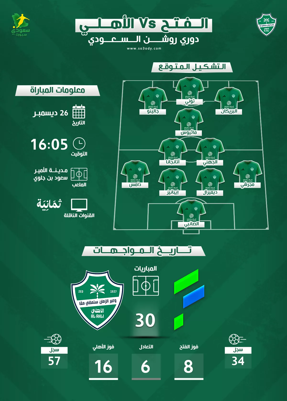 يحل الأهلي ضيفا على الفتح، في الرابعة و5 دقائق من عصر يوم الجمعة الموافق 26 ديسمبر 2025، ضمن لقاءات الجولة 11 من الدوري السعودي.