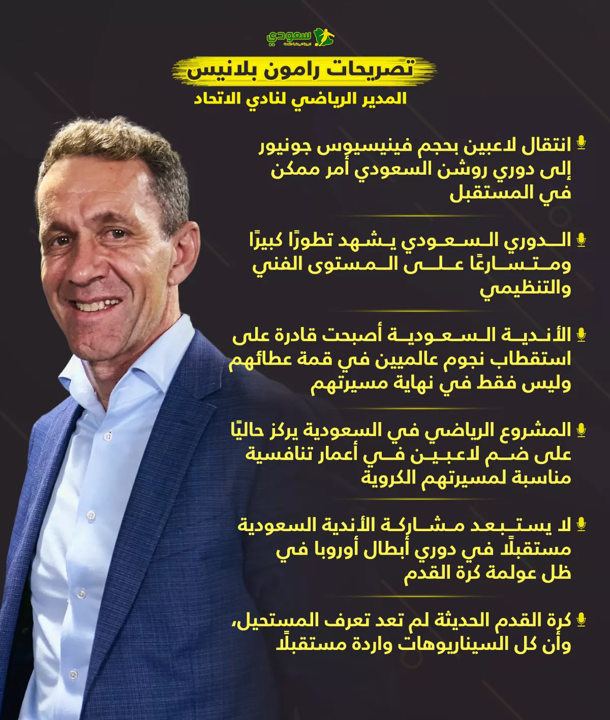 وتعكس تصريحات بلانيس الطموحات الكبيرة للدوري السعودي، ورغبته في ترسيخ حضوره القوي على الساحة الكروية العالمية وجذب أبرز نجوم كرة القدم في السنوات المقبلة.